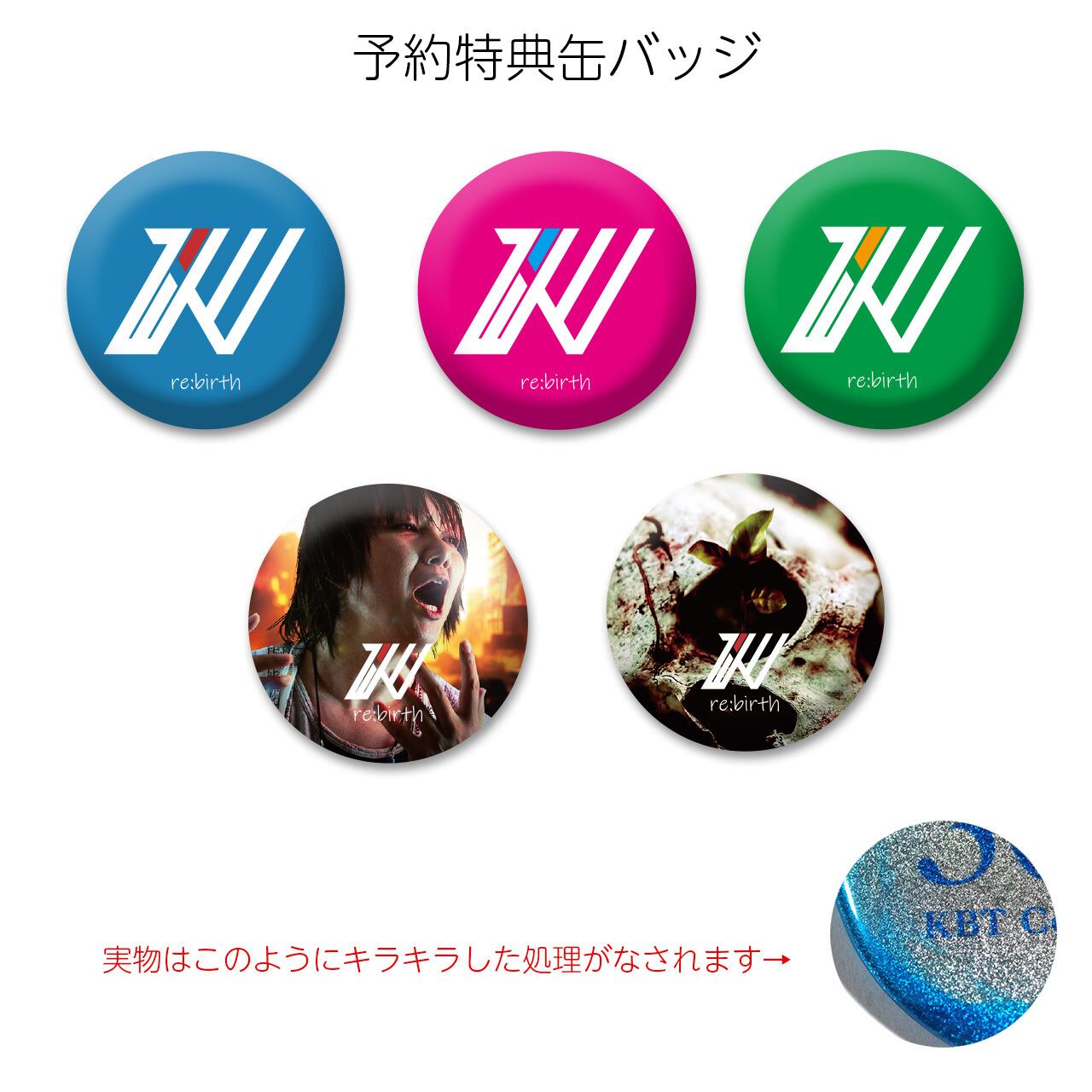 予約特典として"re:birth グリッター缶バッジ"が付いてきます